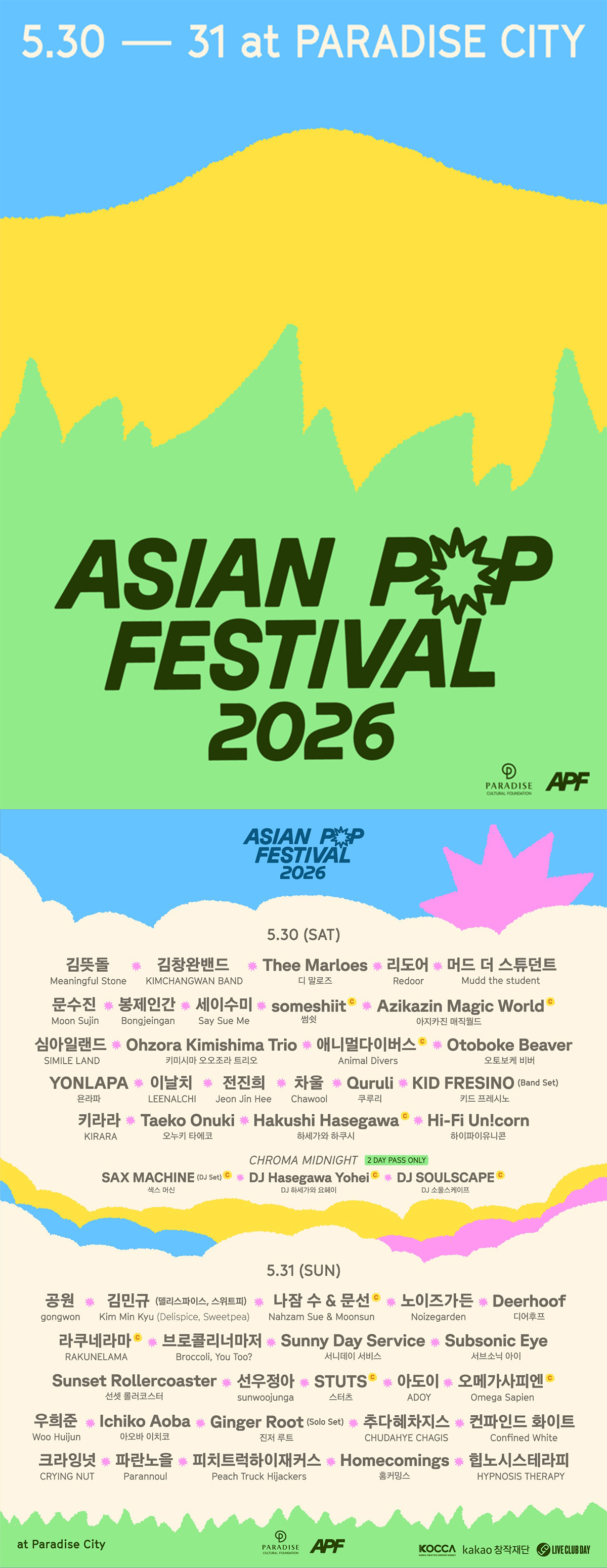 특히 이번 페스티벌은 포크, 록, 시티팝, 힙합, 전자음악 등 장르의 경계를 넘나드는 라인업을 통해 ‘아시아 음악의 현재’를 입체적으로 조망한다. 공연은 라이브 스테이지뿐 아니라 클럽 ‘크로마’에서 진행되는 미드나잇 DJ 무대까지 확장되며, 보다 다층적인 음악 경험을 제공할 예정이다.
