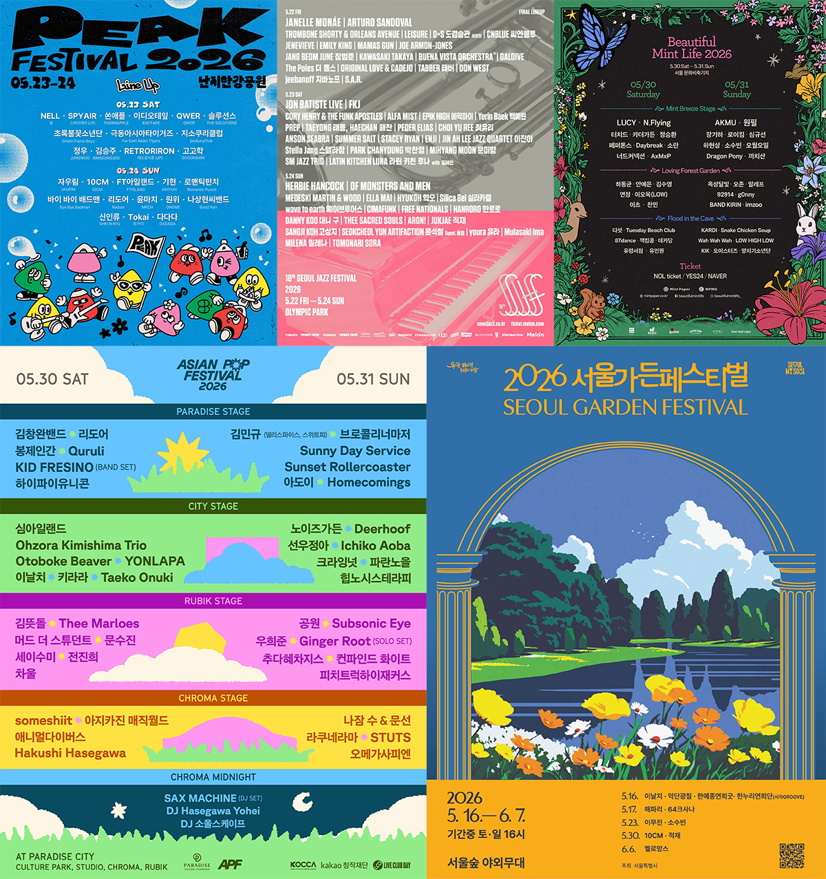 같은 기간, 아시안 팝 페스티벌 2026은 5월 30일부터 31일까지 인천 파라다이스시티에서 개최된다. 서울·도쿄·타이베이 등 아시아 주요 도시의 사운드를 한자리에 모은 이번 페스티벌에는 김창완밴드, 오누키 타에코, 노이즈가든을 비롯해 김민규(델리스파이스·스위트피), DJ 소울스케이프, 선우정아 등이 참여한다. 여기에 선셋 롤러코스터, 키드 프레시노, 세이수미, 디어후프 등 국내외 아티스트들이 더해지며, 포크부터 전자음악, 힙합까지 장르를 넘나드는 구성으로 주목받고 있다.