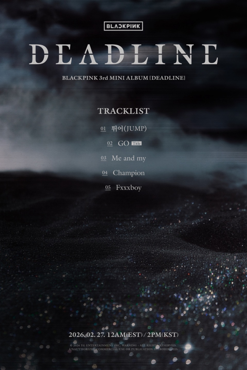 6일 YG엔터테인먼트에 따르면 블랙핑크의 미니 3집 [DEADLINE]은 총 5개 트랙으로 구성됐다. 선공개곡 '뛰어(JUMP)'를 시작으로 타이틀곡 'GO', 'Me and my', 'Champion', 'Fxxxboy'가 차례로 담겼다.