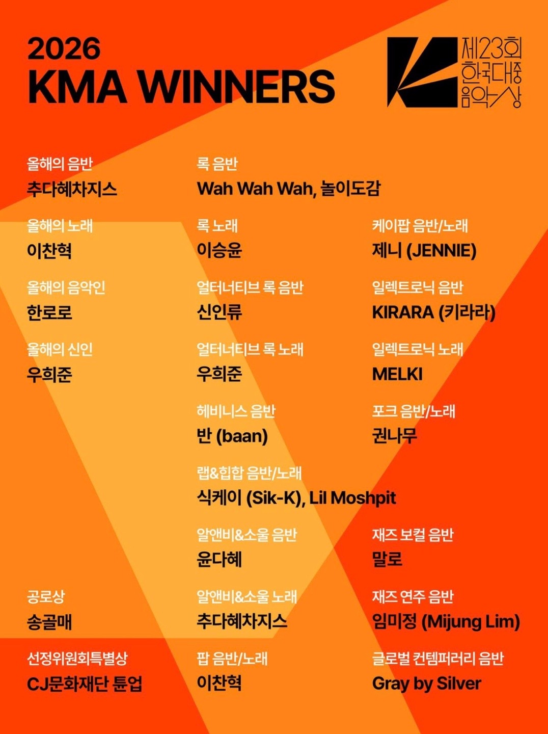 대한민국 대중음악의 예술적 성취를 기리는 ‘제23회 한국대중음악상(KMA)’이 지난 26일 홍대 무신사개러지에서 성황리에 개최됐다. 이번 시상식은 특정 장르에 편중되지 않은 폭넓은 스펙트럼과 음악적 본질에 집중한 시상 결과로 다시 한번 한국 대중음악의 이정표를 제시했다.