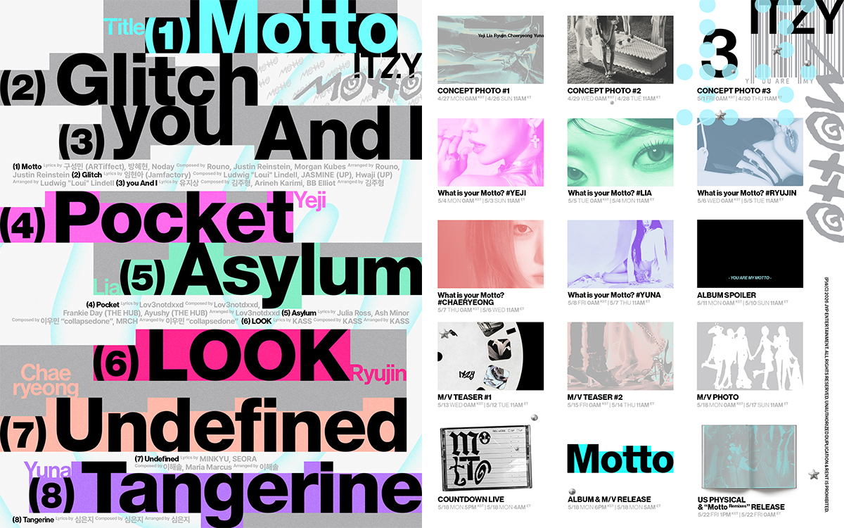 스케줄러 이미지에 따르면 ITZY는 27일부터 콘셉트 포토, 'What is your Motto'라는 이름의 개별 콘텐츠, 앨범 스포일러, 뮤직비디오 티저를 순차 공개하고 분위기를 달군다. 또 새 앨범 발매 당일 오후 5시 카운트다운 라이브를 진행하고 전 세계 믿지(팬덤명: MIDZY)와 컴백을 기념할 예정이다. 22일 오후 1시에는 US 피지컬 앨범, 'Motto' 리믹스 버전이 릴리스된다.
