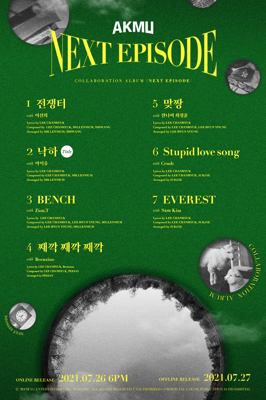 공개된 트랙리스트에 따르면, 악뮤의 새 앨범 '넥스트 에피소드'는 총 7개 트랙으로 구성됐다. 타이틀곡 '낙하'를 비롯해, '전쟁터', '벤치', '째깍 째깍 째깍', '맞짱', '스튜피드 러브 송', '에버레스트'가 차례로 담겼다.
