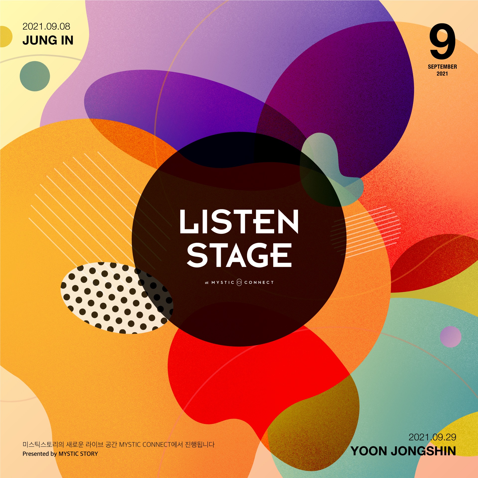 9월의 뮤지션은 미스틱스토리 대표 감성 뮤지션 윤종신과 정인으로, 8일 정인, 29일 윤종신의 고품격 라이브 무대가 미스틱스토리 유튜브 채널을 통해 선보인다.