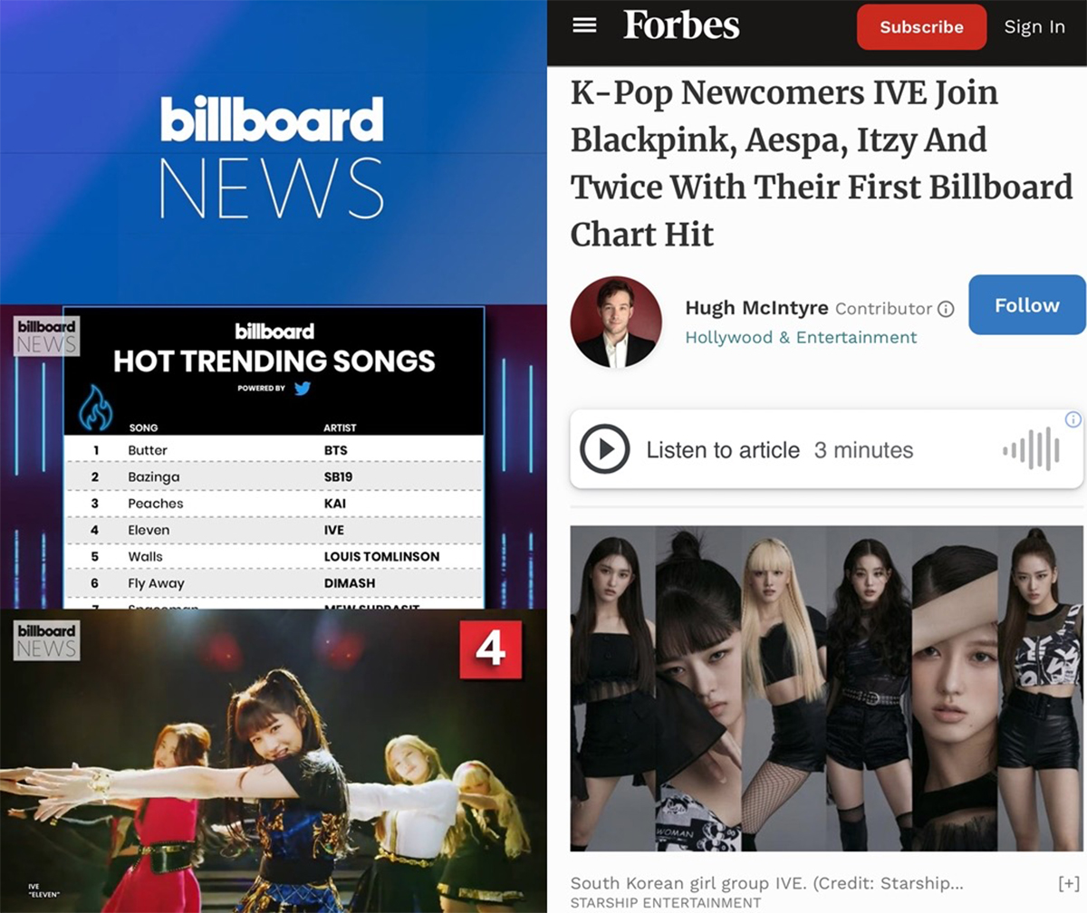 포브스의 HOLLYWOOD&ENTERTAINMENT 담당 칼럼니스트 Hugh McIntyre 역시 “ IVE의 첫 싱글 ‘ELEVEN’이 빌보드 ‘핫 트렌딩 송즈’ 차트에 4위로 들어갔다. IVE는 이제 역대 최고의 걸그룹들과 어깨를 나란히 하며, 이 차트에 오른 다섯 번째 한국 걸그룹”이라고 전했다.