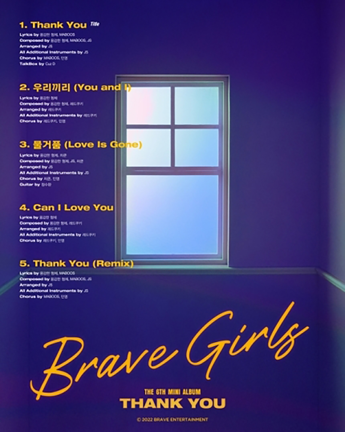 지난 4일 브레이브 엔터테인먼트는 공식 SNS를 통해 오는 14일 발매되는 브레이브걸스의 미니 6집 ‘THANK YOU’의 트랙리스트를 공개했다.