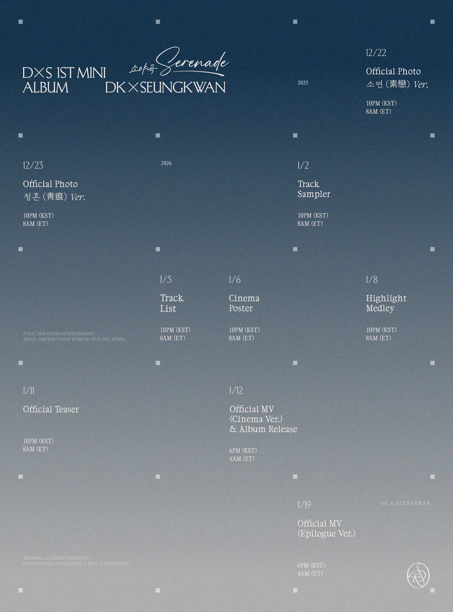 하이브 뮤직그룹 플레디스 엔터테인먼트는 지난 18일 오후 10시 세븐틴 공식 SNS에 도겸X승관 미니 1집 ‘소야곡’의 프로모션 스케줄러를 게재했다. 눈 내리는 밤의 풍경을 연상시키는 이미지가 겨울 감성 가득한 앨범을 기대하게 한다.
