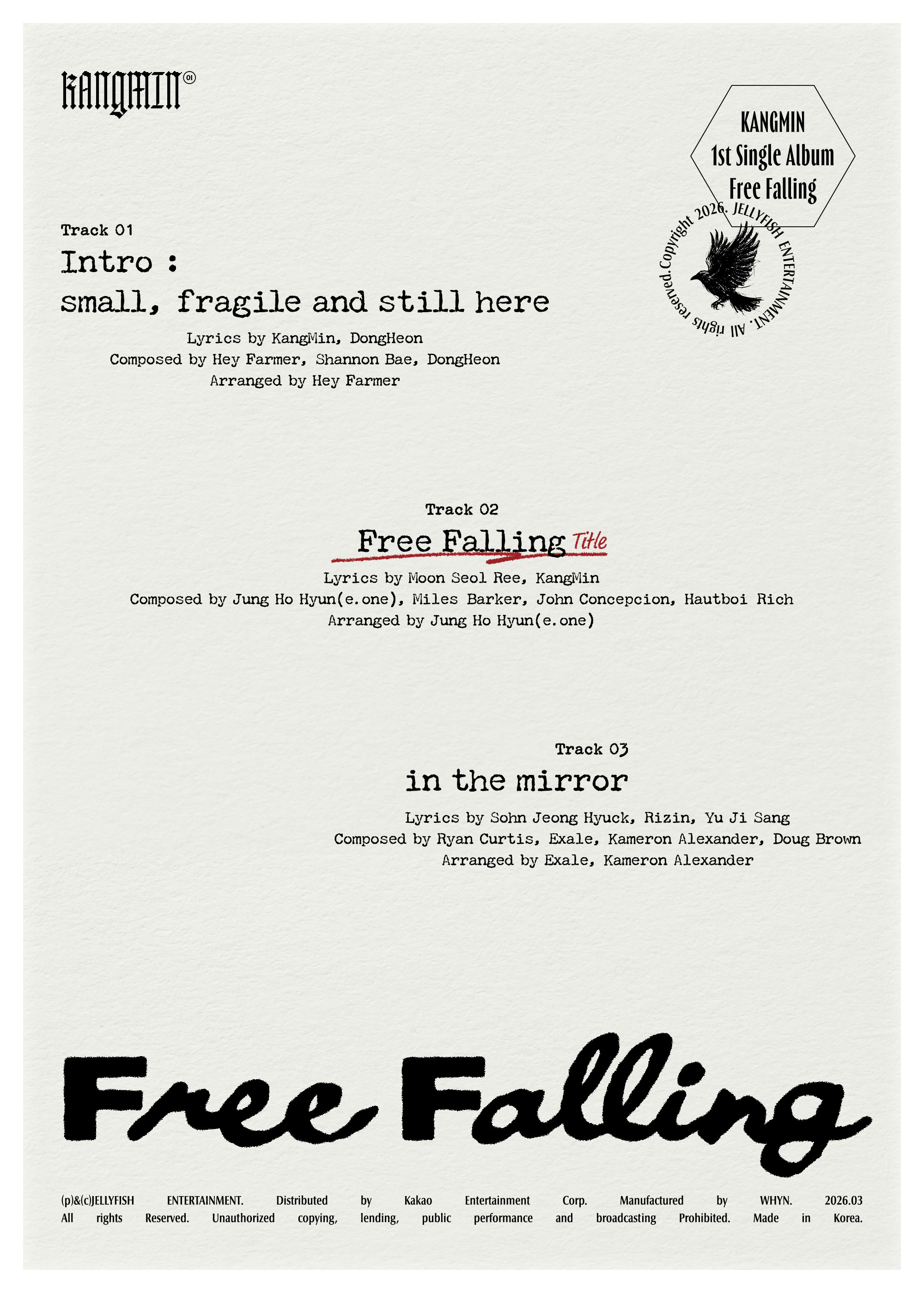 이어 공개된 트랙리스트 이미지에서는 타이틀곡 ‘Free Falling’을 비롯해 ‘Intro : small, fragile and still here’, ‘in the mirror’까지 총 세 가지 트랙이 베일을 벗었다. 특히 인트로와 타이틀곡은 강민이 직접 작사에 참여했으며, 인트로에는 베리베리 리더 동헌이 함께 작사, 작곡에 참여해 지원사격에 나서며 특별한 의미를 더했다.