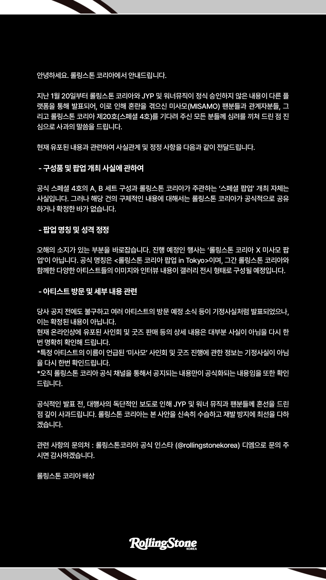 지난 1월 20일부터 롤링스톤 코리아와 JYP 및 워너뮤직이 정식 승인하지 않은 내용이 다른 플랫폼을 통해 발표되어, 이로 인해 혼란을 겪으신 미사모(MISAMO) 팬분들과 관계자분들, 그리고 롤링스톤 코리아 제20호(스페셜 4호)를 기다려 주신 모든 분들께 심려를 끼쳐 드린 점 진심으로 사과의 말씀을 드립니다.