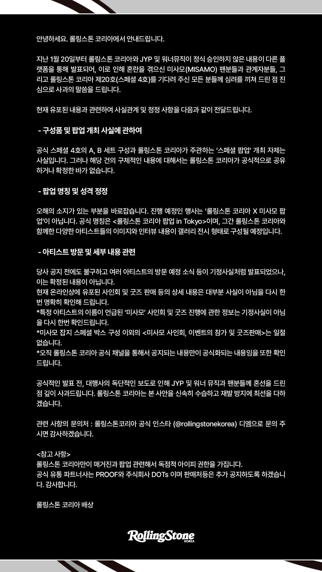 지난 1월 20일부터 롤링스톤 코리아와 JYP 및 워너뮤직이 정식 승인하지 않은 내용이 다른 플랫폼을 통해 발표되어, 이로 인해 혼란을 겪으신 미사모(MISAMO) 팬분들과 관계자분들, 그리고 롤링스톤 코리아 제20호(스페셜 4호)를 기다려 주신 모든 분들께 심려를 끼쳐 드린 점 진심으로 사과의 말씀을 드립니다.